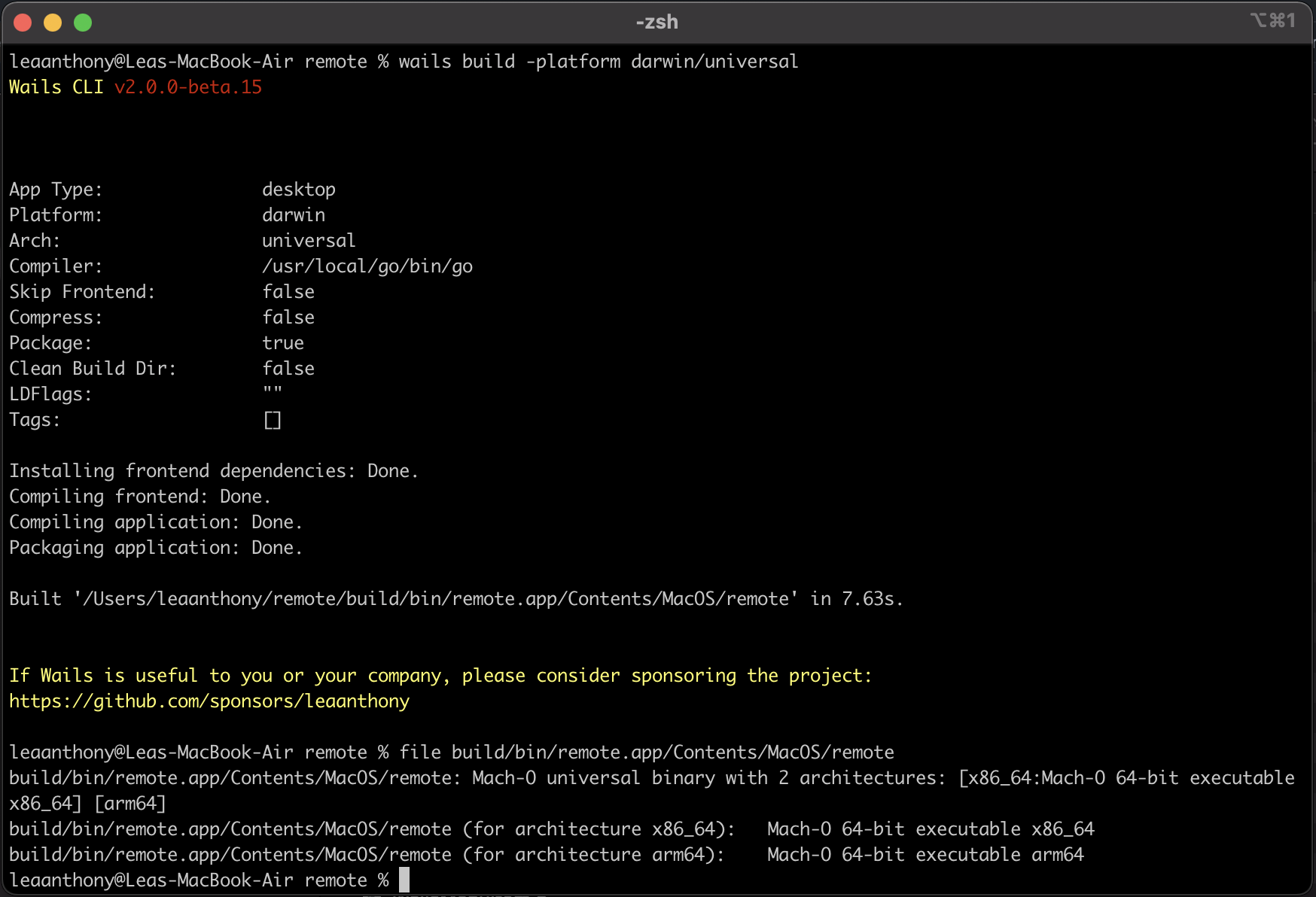 • If the build is for darwin/universal it builds 2 binaries, one for darwin/amd64 and one for darwin/arm64 and then creates a fat binary using lipo